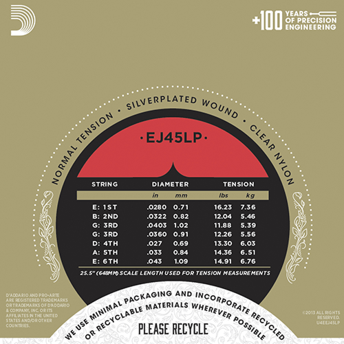 The normal tension D’Addario EJ45LP is the best selling lightly polished Pro-Arté set, preferred for its balance of rich tone and smooth feel. Pro-Arté lightly polished composite strings feature an exclusive multifilament core material which delivers a powerful, but warm tone which lasts 2–3 times longer than traditional classical strings. Each wound string is polished to a smooth surface for reduced finger noise. In addition to three traditional nylon treble strings, the EJ45LP set contains an optional monofilament composite 3rd/G string, which provides greater projection and optimal balance between basses and trebles. All Pro-Arté treble strings are sorted by a sophisticated computer-controlled laser machine which performs diameter/tension measurements and quality checks, ensuring true sounding, precise trebles in every set. Pro-Arté lightly polished sets are also ideal for recording.